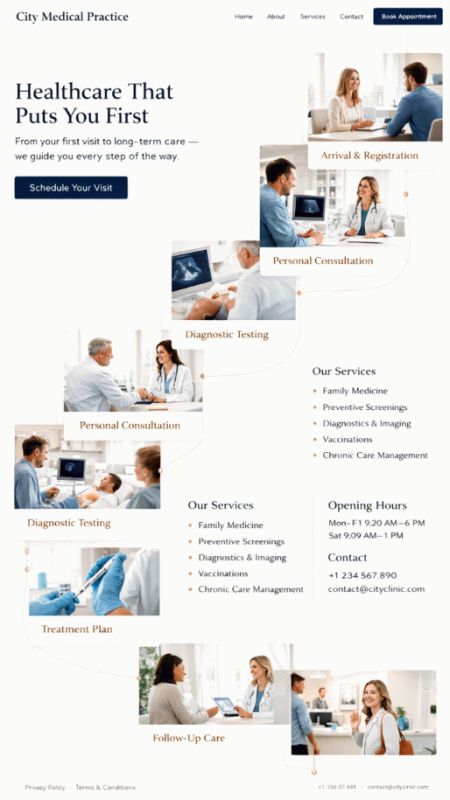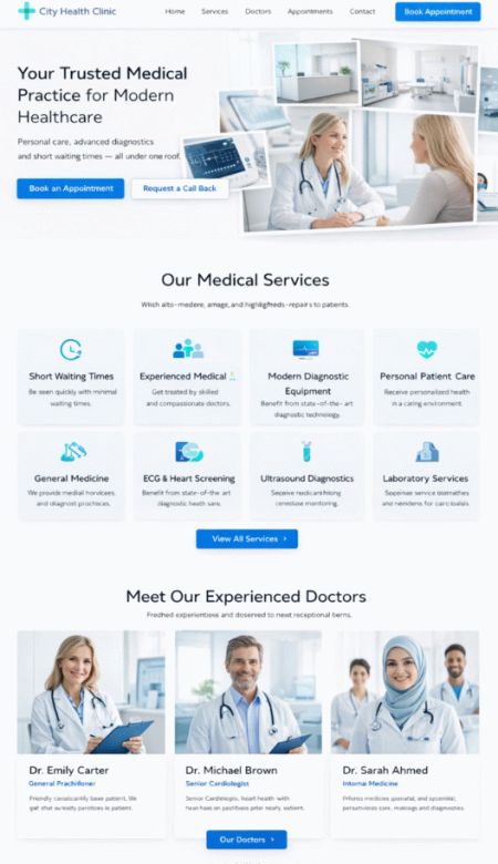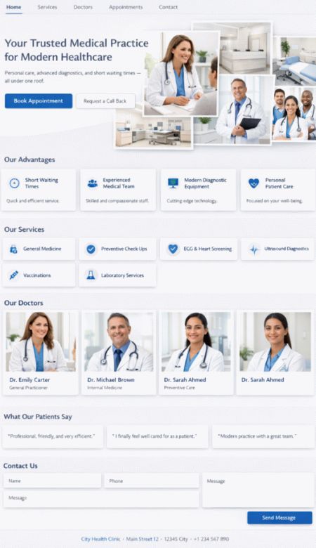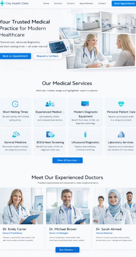 Profesjonalnie przedstaw swoją praktykę: specjalizacje, oferta usług, zespół, lokalizacje, godziny otwarcia i drogi kontaktowe. Uzupełnij o rezerwacje online, formularze dla nowych pacjentów i jasne informacje o procesach. Opcjonalnie z sekcją aktualności, wielojęzycznością, zabezpieczonymi strefami dla pacjentów i stronami dokumentów (np. formularze zgody, wskazówki, pliki do pobrania).
