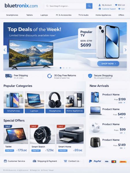 Nowoczesny sklep internetowy potrzebuje więcej niż ładnych stron produktów: szybkie czasy ładowania, czysty proces zakupu, bezpieczne płatności, jasna logika wysyłki, przejrzyste zwroty i system, który działa niezawodnie pod obciążeniem. Do tego dochodzą prawne strony obowiązkowe, śledzenie, procesy marketingowe i czysta baza danych. Z bluetronix otrzymujesz swój sklep jako skalowalne rozwiązanie – od szybkiej wersji startowej po konfigurację enterprise z własną strukturą serwera, rolami/prawami, interfejsami i automatyzacjami. Zaczynasz na małą skalę, później rozszerzasz celowo – bez zmiany systemu.