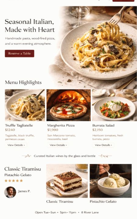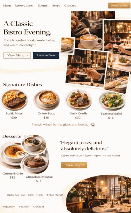 Czysta struktura dla lokalnego wyszukiwania: godziny otwarcia, adres, mapa, zdjęcia, FAQ. Dzięki temu goście szybciej Cię znajdą i szybciej dokonają rezerwacji.